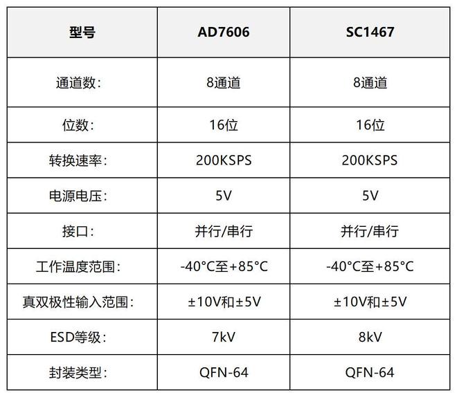 2、采样速率对比:AD7606的所有通道都能达到200KSPS的采样速率,SC1467所有8个通道的吞吐速率也可达到200kSPS,两款都能快速地对模拟信号进行采样转换,适用于对实时性要求较高的应用场景。